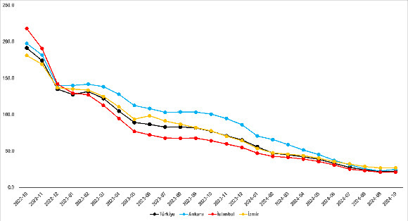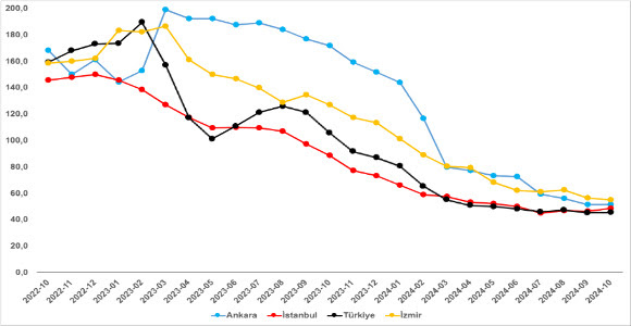 Cari fiyatların yıllık artışları 3 büyük şehir için Ekim 2024’te geçen aylardaki trendin aksine yukarı yönlüdür. İstanbul’da zirveye (yüzde 240,9) Temmuz 2022’de ulaşıldıktan sonra düşüş başlamış ve yıllık fiyat artışı Ekim 2024’te yüzde 21’e gerilemiştir. Ankara ve İzmir’de ise zirveye Eylül 2022’de ulaşılmış (yüzde 205,6 ve yüzde 183,1) Ekim 2024’te bu iki ilimizde yıllık artış oranları, sırasıyla, yüzde 24,7’e ve yüzde 26,7’ye gerilemiştir. (Şekil 4)