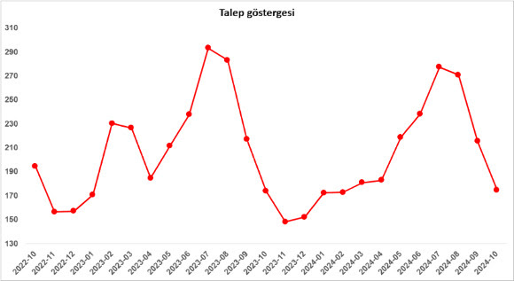 Ocak 2023’te istisnai bir yükselişle 235’e ulaşan talep endeksi, Şubat 2023 depreminin ardından düşüş yönlü bir seyir izleyerek Kasım 2023’te 88,7’ye kadar gerilemişti. Aralık 2023’ten itibaren yönünü yukarı çeviren endeks eylülden ekime yüzde 4,5’lik bir artışla 165’e ulaşmıştır. Geçen yılın ekim ayına kıyasla endeks yüzde 69,2 daha yüksektir. (Şekil 5)