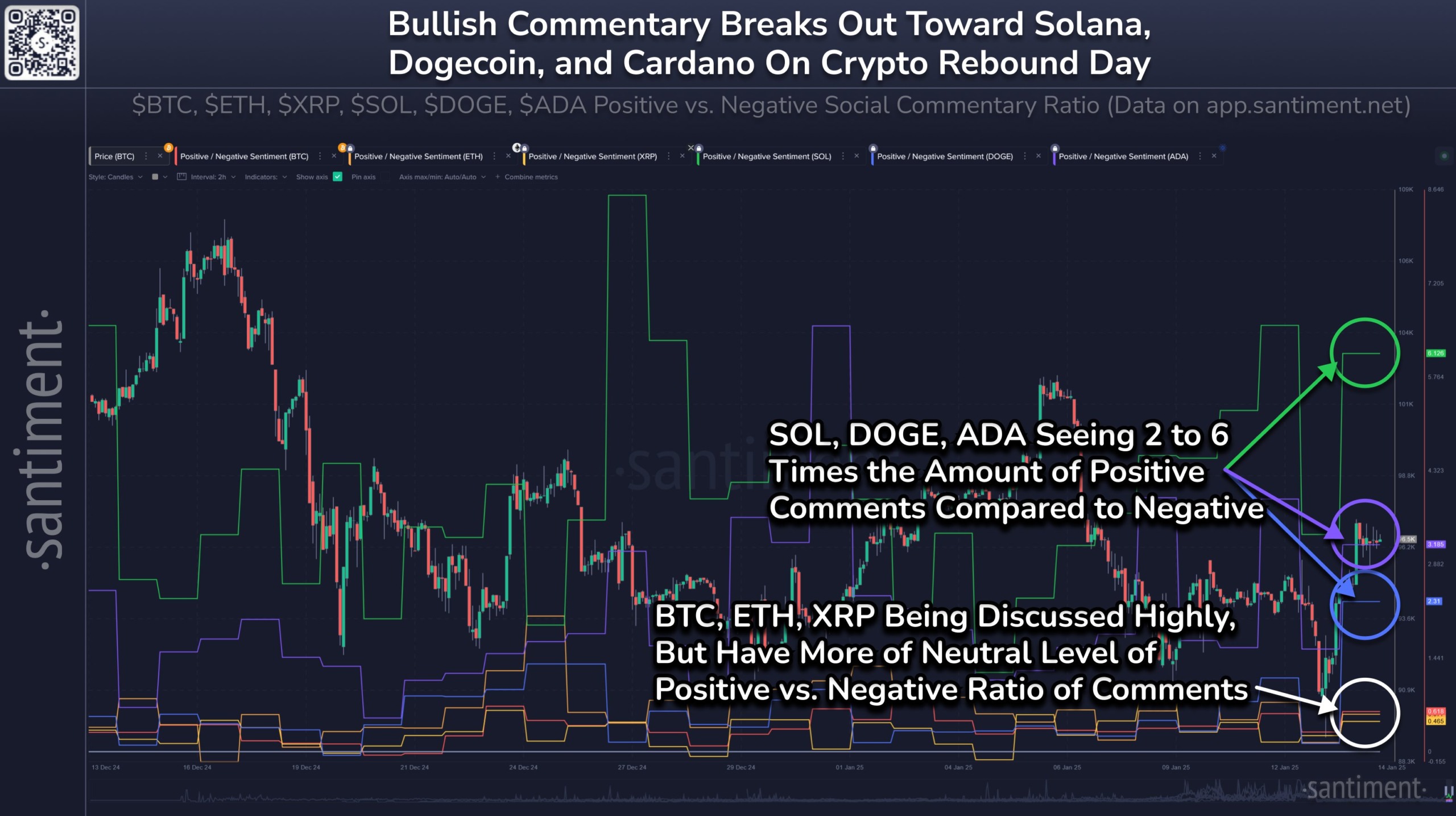 Kripto para piyasası veri ve analiz platformu Santiment, sosyal medya etkileşimlerinin Solana, Cardano ve Dogecoin üzerindeki olumlu duyarlılığa işaret ettiğini bildirdi. Analiz platformuna göre, Bitcoin, Ethereum ve XRP daha nötr bir duyarlılığa sahip.  Kripto piyasası, piyasa katılımcılarının Trump yönetiminden gelen mali ve ekonomik teşviklerdeki belirsizlikten korkması nedeniyle yıl başından bu yana zorlu bir başlangıç yaptı. İşler soğumuş gibi görünüyor ve piyasa 1 Ocak’taki kanamadan sonra toparlanmaya başlamış gibi görünüyor.  Öncelikle makroekonomik göstergelerdeki değişiklikler nedeniyle ABD ekonomisindeki belirsizlikten kaynaklanan erime, Bitcoin ve Ethereum’un sırasıyla 95 bin ve 3.100 doların altına düştüğünü gördü.