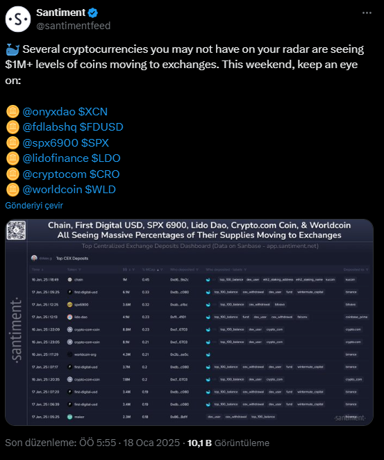 Kripto para piyasası sadece Bitcoin ve Ethereum gibi tanınmış kripto paralarla sınırlı değil, aynı zamanda daha az bilinen altcoinlerde de önemli faaliyetler gerçekleşiyor. Bir kripto analiz platformu olan Santiment, radarlardan kaçan bazı kripto para birimlerinin borsalara 1 milyon doları aşan büyük miktarlarda transfer gerçekleştirdiğini bildirdi. Bu durum, yaklaşan piyasa hareketlerinin potansiyel bir göstergesi olarak görülüyor. Santiment’in bu hafta sonu dikkat edilmesini önerdiği kripto para birimleri Onyx (XCN coin), FDUSD, SPX, Lido DAO (LDO), Crypto.com Coin (CRO) ve Worldcoin (WLD). Bu madeni paraların borsalara yüksek hacimli transferleri, yatırımcıların satış yapmaya veya ticaret stratejilerini ayarlamaya hazırlanıyor olabileceğini gösteriyor.