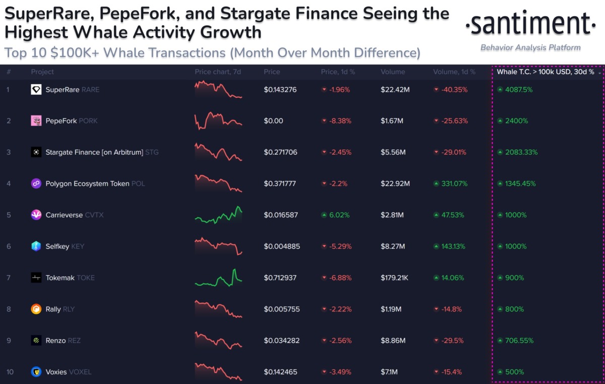 Kriptokoin.com’dan takip ettiğiniz üzere, kripto para piyasası bugün sert satışlarla karşılaştı. Bununla birlikte, balinalar bu düşüşü değerlendirmek için çalışıyor. Bu düşüşe rağmen kripto balinaları, hala aktif olarak altcoin işlemleri gerçekleştiriyor. Analitik platformu Santiment, balina aktivitesinde en yüksek artışı yaşayan ilk 10 altcoini belirledi. Bu 10 proje arasında Superrare (RARE Coin), Pepeforketh (PORK), Stargatefinance (STG), Polygon (POL), Carrieverse (CVTX), Selfkey (KEY), Tokemakxyz (TOKE), Rally_io (RLY), Renzoprotocol (REZ) ve Cryptovoxels (VOXEL) yer alıyor.