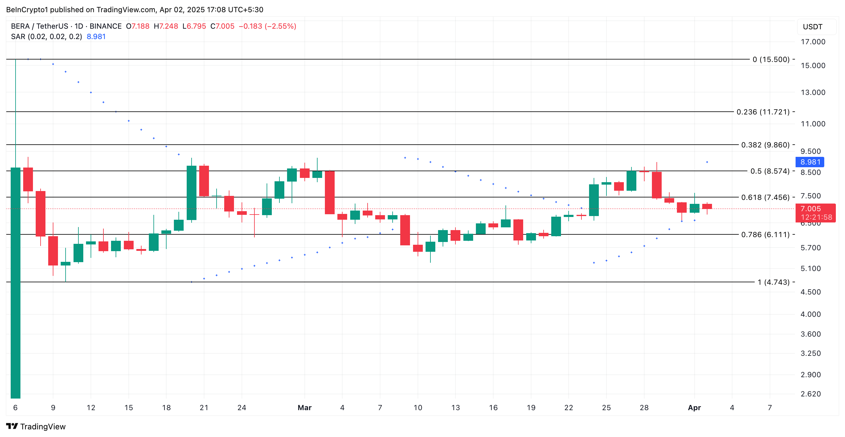 BERA, bugün trend olan bir başka altcoin. Şu anda 7 dolardan işlem görüyor ve geçtiğimiz gün %2’lik bir fiyat düşüşü kaydetti. Günlük grafikte, BERA’nın Parabolik Durdurma ve Ters Çevirme (SAR) göstergesi, fiyatının üzerinde 8,98 dolarlık dinamik bir direnç oluşturdu. Bu, bugün BERA traderları arasında artan satış baskısını vurguluyor.