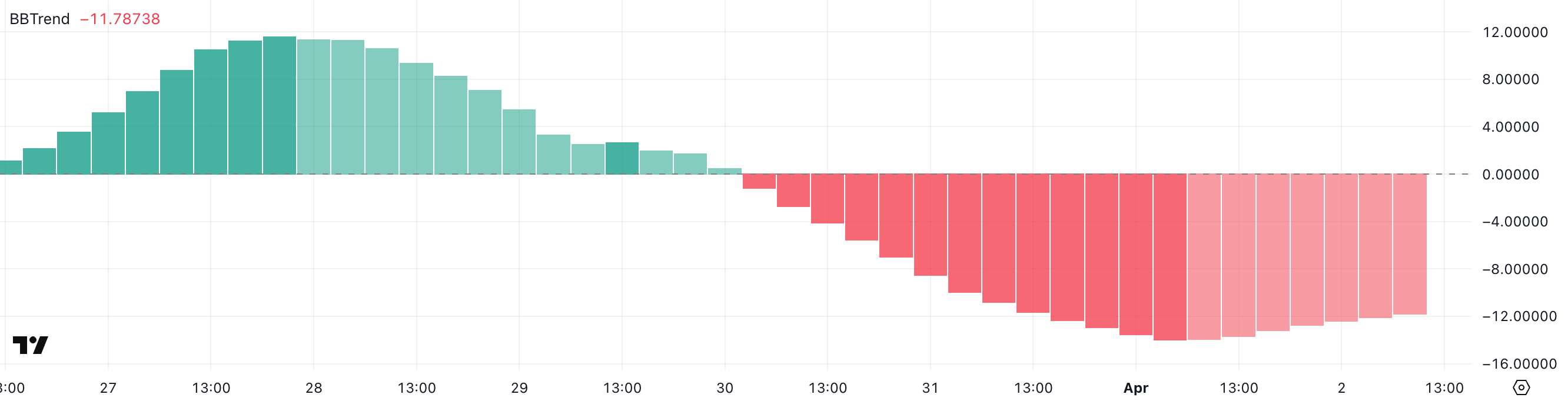 DOGE için kullanılan BBTrend göstergesi hâlâ -10 seviyesinin altında, yani güçlü düşüş bölgesinde. Ancak -13.96’dan -11.78’e kadar gelen bu toparlanma, satış baskısının yavaş yavaş kırıldığını gösteriyor. Bu tarz düşük değerler, genellikle aşırı satış bölgelerini işaret eder.