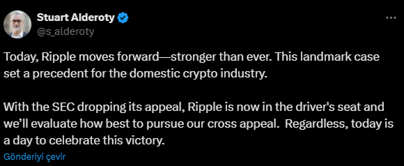 Ripple’ın Baş Hukuk Yetkilisi Stuart Alderoty, SEC’in temyizden vazgeçmesini olumlu bir gelişme olarak değerlendirdi. Ancak Ripple’ın önünde hâlâ kritik kararlar bulunuyor. Şirket, temyize karşı çapraz itirazda bulunarak daha geniş hukuki kazanımlar elde etmeyi değerlendirebilir ya da mevcut hukuki süreci tamamlamak için SEC ile uzlaşmaya yönelebilir.