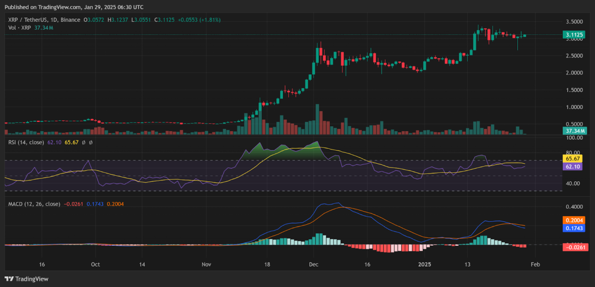 XRP şu anda 3.11 dolardan işlem görüyor. Son bir yılda %492’lik bir yükseliş kaydetti. Şu anki fiyat, tüm zamanların en yüksek seviyesi olan 3.84 dolara sadece %18.96 uzaklıkta. Teknik analizler, XRP fiyatının güçlü bir bölgede olduğunu gösteriyor. RSI değeri 62.10 seviyesinde ve alıcıların kontrolü elinde tuttuğuna işaret ediyor.