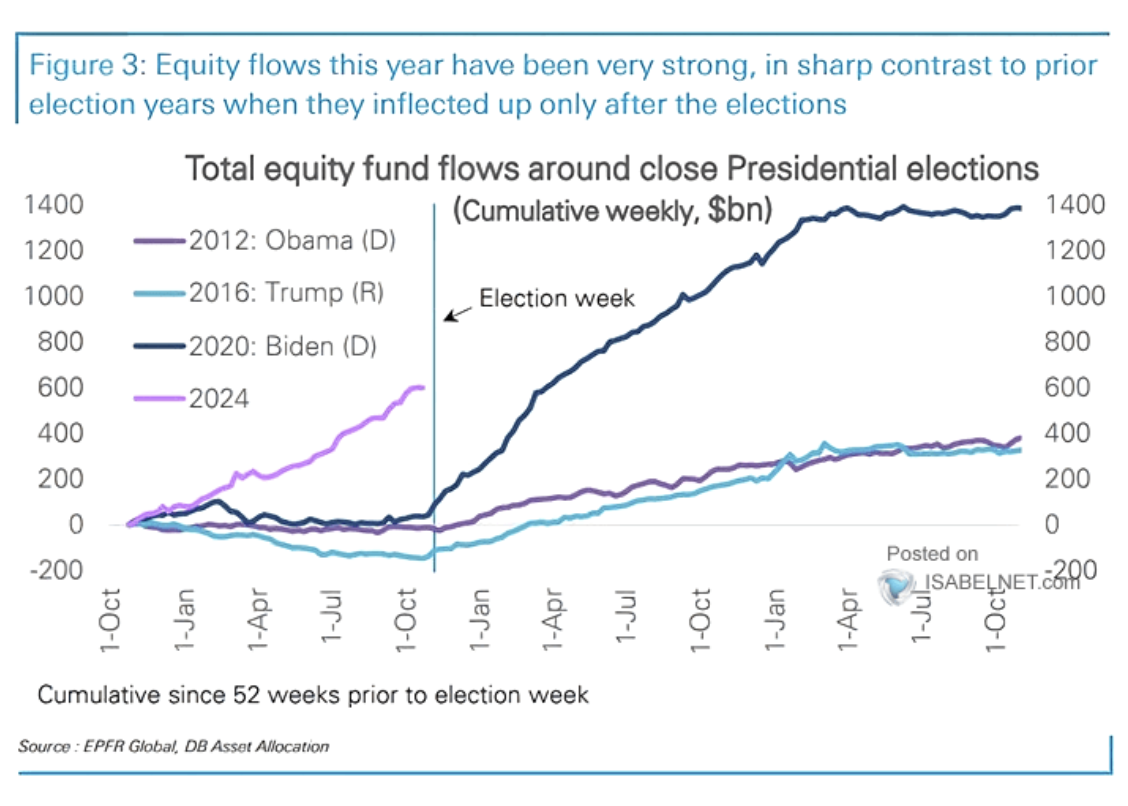 Grafikte “Total Equity Fund Flows,” yani toplam hisse senedi fon akışları, başkanlık seçimleri öncesinde ve sonrasında meydana gelen değişimler ile incelenmektedir.