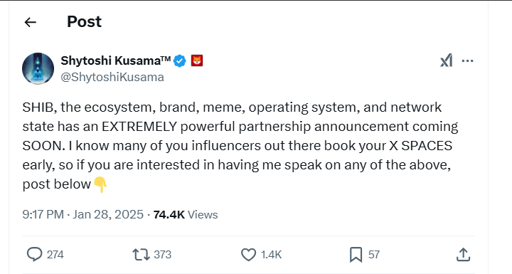Shiba Inu ekosistemi baş geliştiricisi Shytoshi Kusama, önemli bir ortaklığın ipuçlarını veriyor. Bu ortaklığın, tüm Shibarium projelerini ve daha geniş kripto alanını önemli ölçüde etkileyebileceğini ileri sürüyor.