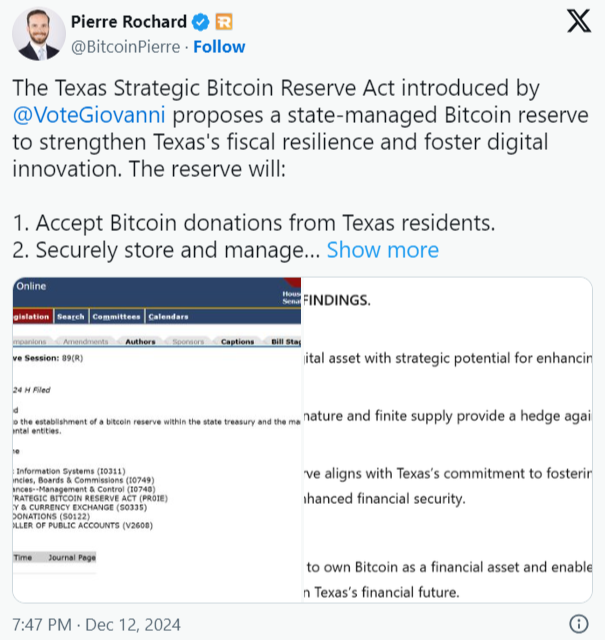 Daha umut verici bir hareket olarak, Temsilci Giovanni Capriglione devlet kurumlarının farklı dijital para birimlerini kabul etmesini istiyor. Devletin daha sonra bu varlıkları stratejik Bitcoin rezervini desteklemek için dönüştürmesi mümkün. Tasarı son olarak BTC rezervinin güvenliği, bağışları ve yönetimine ilişkin kuralları belirledi. Tasarıda açıklandığı üzere Bitcoin, merkezi bir otorite olmaksızın çalışan bir peer-to-peer (P2P) ağı temsil ediyor. Tasarı başvurusu, Başkan Donald Trump’ın Federal Düzeyde benzer bir BTC rezervi oluşturma çabasının hemen ardından geldi. Bunu başarmak için, uygulamayı denetlemek üzere bir kripto danışma konseyi kurulmasını önerdi.