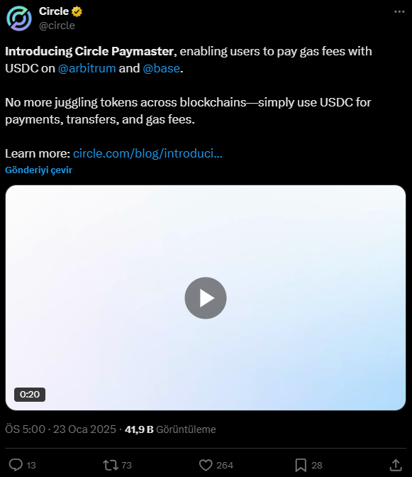 Circle’ın resmi blogunda belirtildiği gibi, Paymaster özellikle gaz ücretleri ödemelerinde daha kolay bir süreç sunuyor. Kullanıcılar artık ETH transferi veya işlem yapmak zorunda kalmadan, direkt olarak USDC kullanabilecekler. Circle, sosyal medya platformu X üzerinden yaptığı duyuruda şunları söyledi: