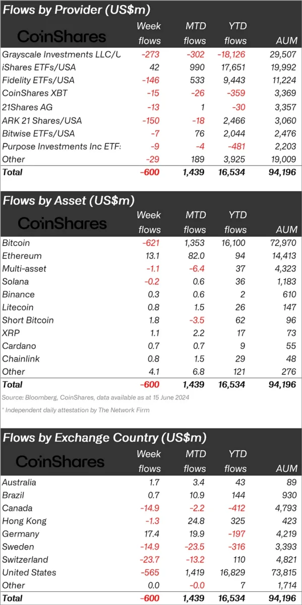 Kripto para piyasası, ABD enflasyon verilerinin beklentileri karşılamasının ardından gelen şahin Federal Açık Piyasa Komitesi (FOMC) toplantısıyla sarsıldı. Varlık yönetim şirketi CoinShares’ın raporuna göre Bitcoin yatırım ürünleri geçen hafta toplam 621 milyon dolarlık çıkış gördü. Bu durum, Mart ayından bu yana kaydedilen en yüksek geri çekiş olarak öne çıktı. Rapora göre haftalık bazda SOL coin ve Bitcoin’den çıkış görülürken, Ethereum, BNB, Litecoin, short Bitcoin, XRP, Cardano gibi kriptolara fon girişi olduğu dikkat çekti. İşte detaylar…