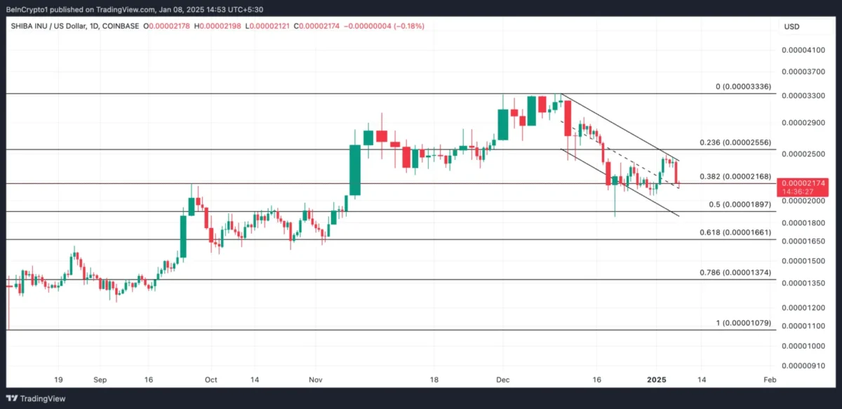 Günlük grafikte, SHIB son 30 gündür aşağı yönlü paralel bir kanal içinde işlem görüyor. Bu düşüş eğilimli model, sürekli olarak daha düşük zirve ve daha düşük dip seviyelerini işaret ediyor. Bu da satış baskısının sürdüğüne dair bir gösterge. Eğer SHIB bu model içinde kalırsa, uzmanalara göre fiyatı 0.000018 seviyesine kadar düşecek.
