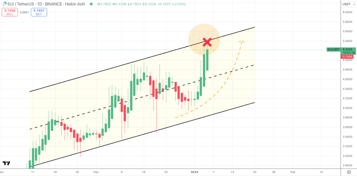 SUI tokenleri, iki gün önceki zirve seviyesinden sonra ciddi bir düşüş riskiyle karşı karşıya. Fiyatın 4,56 seviyesine inmesi, 20 milyon dolarlık bir likidasyona yol açacaktır. Talnızca bu altcoinin değil, genel kripto piyasasının da satış baskısına maruz kalmasına neden olacak. Yine de bazı analistler, SUI’nin yükselen trendde kalacağını ve 5,50 direncini aşması durumunda iyimser bir görünüm kazanacağını düşünüyor. Kriptokoin.com olarak aktardığımız SUI Token fiyat tahminlerine bu yazıdan göz atabilirsiniz.