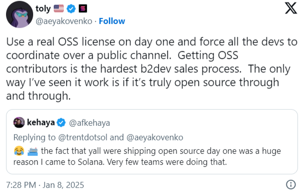 Özellikle, geliştirici koordinasyonunun işe yaradığını gördüğü tek şeyin sürecin açık kaynaklı olması olduğunu iddia ediyor. Bu arada, X’te kehaya olarak bilinen Solana Vakfı katılımcısından bir yorum geldi. Solana’nın Açık Kaynak Kullanımını daha önce doğru bir şekilde gerçekleştirmiş olmasının ekosisteme katılma nedenini oluşturduğunu söyledi.