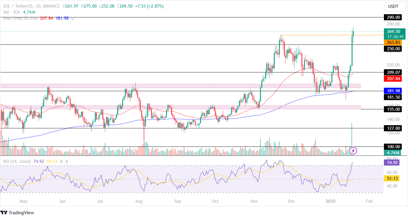 SOL fiyatının 300 dolara ulaşması, mevcut yukarı yönlü hareketin korunmasına bağlı. Eğer boğalar piyasayı kontrol etmeye devam ederse, fiyat 300 doları aşabilir. Bu noktada alıcı ilgisi artarsa, 350 dolarlık yeni bir zirve görülebilir.