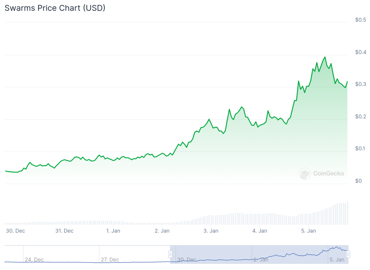 Aşağıdaki grafikten de gördüğünüz üzere Swarms (SWARMS), son zamanlarda yükseliş trendi içinde. Solana tabanlı altcoin, bu ivme sayesinde kısa sürede 300 milyon dolar piyasa değerini aştı. Bu ivmeye, son 24 saat içindeki %7 ve son bir hafta içindeki %700’ün üzerinde yükseliş eşlik ediyor.
