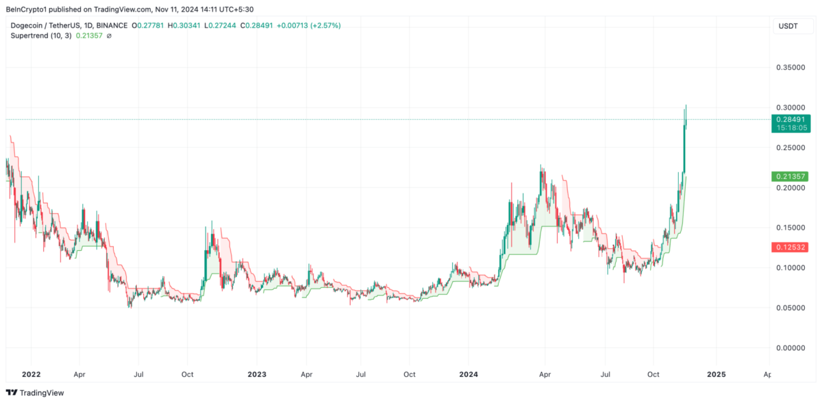 Önde gelen meme coin Dogecoin (DOGE), son birkaç gündür dikkat çekici bir fiyat artışı yaşadı. Şu anda 0,28 dolardan işlem görüyor ve son yedi günde %88’lik bir fiyat artışı kaydetti. Bu önemli yükseliş, DOGE’un piyasa değerinde Ripple’ın XRP’sini geçmesine neden oldu. Güçlenen alım baskısıyla meme coin, kazançlarını artırmaya devam etmeye hazır görünüyor. İşte bunun nedenleri. Mevcut değeriyle Dogecoin, Aralık 2021’den bu yana en yüksek fiyatında işlem görüyor ve son 24 saatte etkileyici bir şekilde %25 oranında artış gösterdi. Bu yükseliş, DOGE’un piyasa değerini 42 milyar doların üzerine çıkararak, XRP’nin 37 milyar dolarlık değerlemesini geride bırakmasını sağladı.