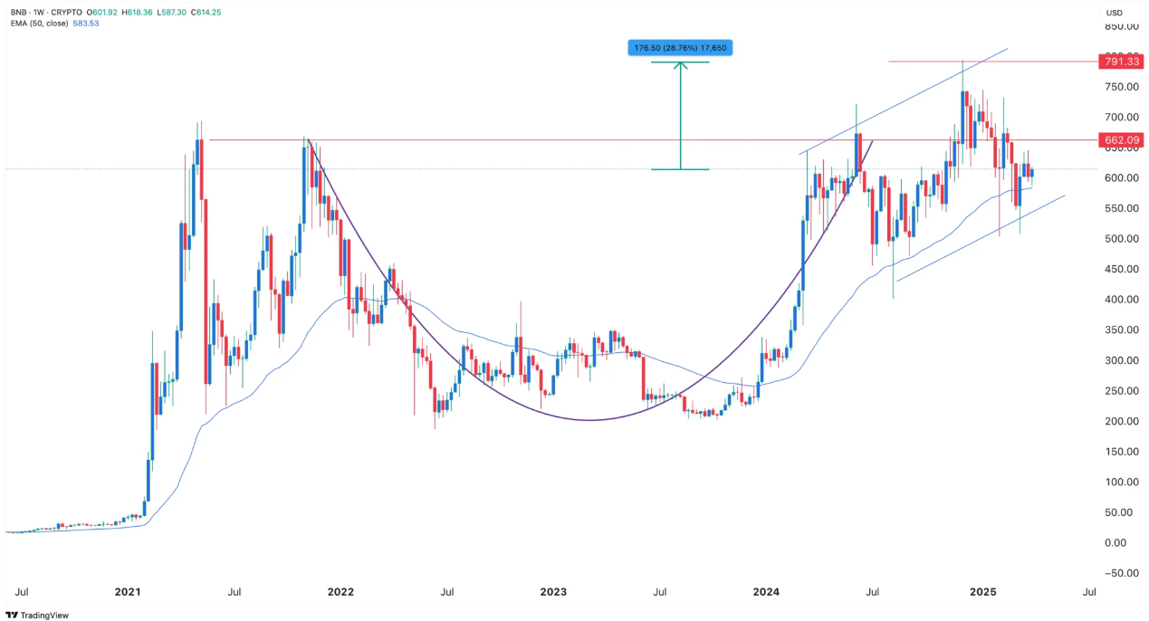 BNB fiyatı şu an 603 dolar civarında işlem görüyor. Teknik olarak incelendiğinde, BNB grafiği “cup and handle” formasyonunu tamamlamak üzere. Eğer fiyat 662 dolar seviyesini hacimli bir şekilde kırarsa, tüm zamanların zirvesi olan 790 dolara kadar bir ralli ihtimali gündeme gelebilir.