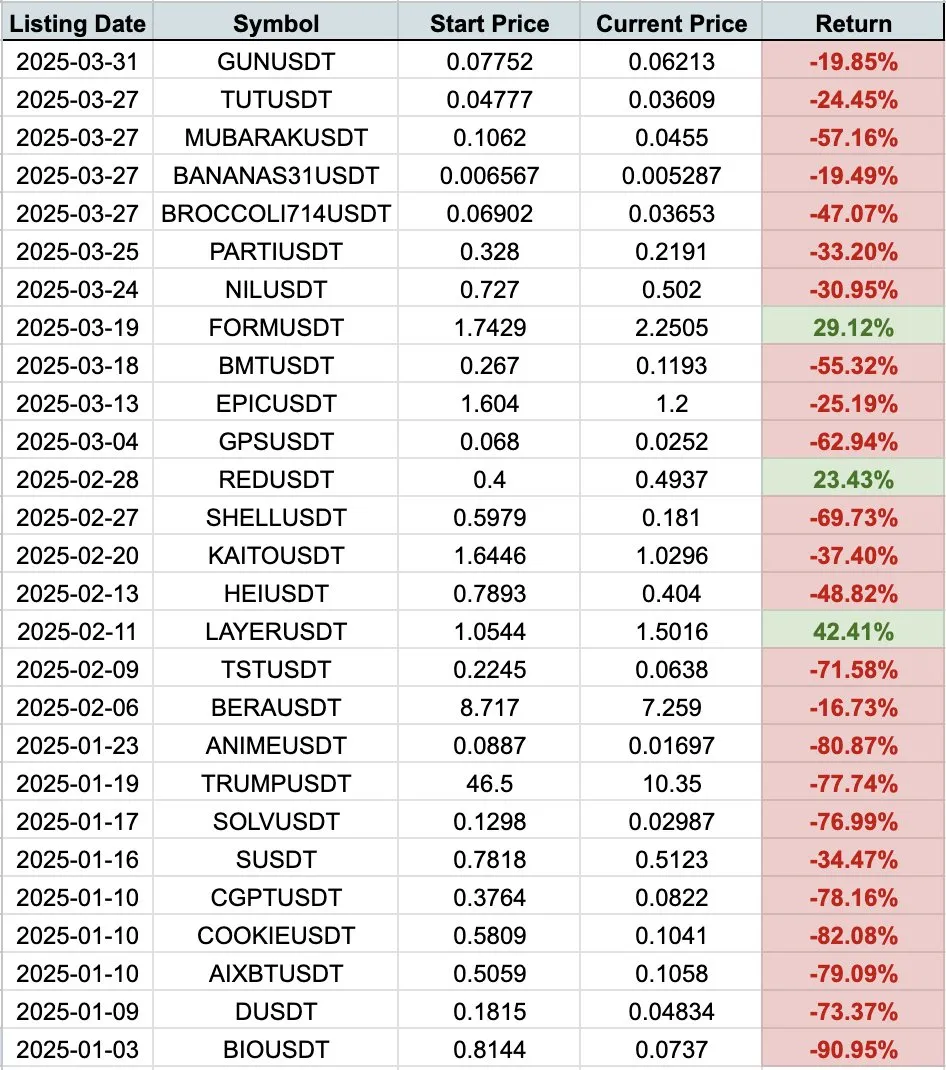 Sadece 2025 değil, 2024’te listelenen token’ların da tümü negatif performans sergiledi. Kayıplar %23’ten başlayıp %95’e kadar çıktı. Yani düşüş, tek bir yıla ya da birkaç projeye özgü değil. Bu da daha geniş bir listeleme sorununun varlığına işaret ediyor.