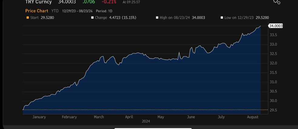 Aşağıda göreceğiniz üzere sene başından bu yana kurdaki artış %15, tahmini Ağustos enflasyonu ile 8 aylık enflasyon ise %32. Yani TL’de ciddi bir reel değerlenme söz konusu. Bu bilinçli tercihin iki nedeni vardı: TL’yi istikrarlı kılarak dövizden TL’ye geçişi sağlamak (oldu) ve geçişkenliği sınırlayarak enflasyonu aşağı çekmek (gecikmeli etkiler nedeniyle yeni yeni görmeye başlıyoruz).