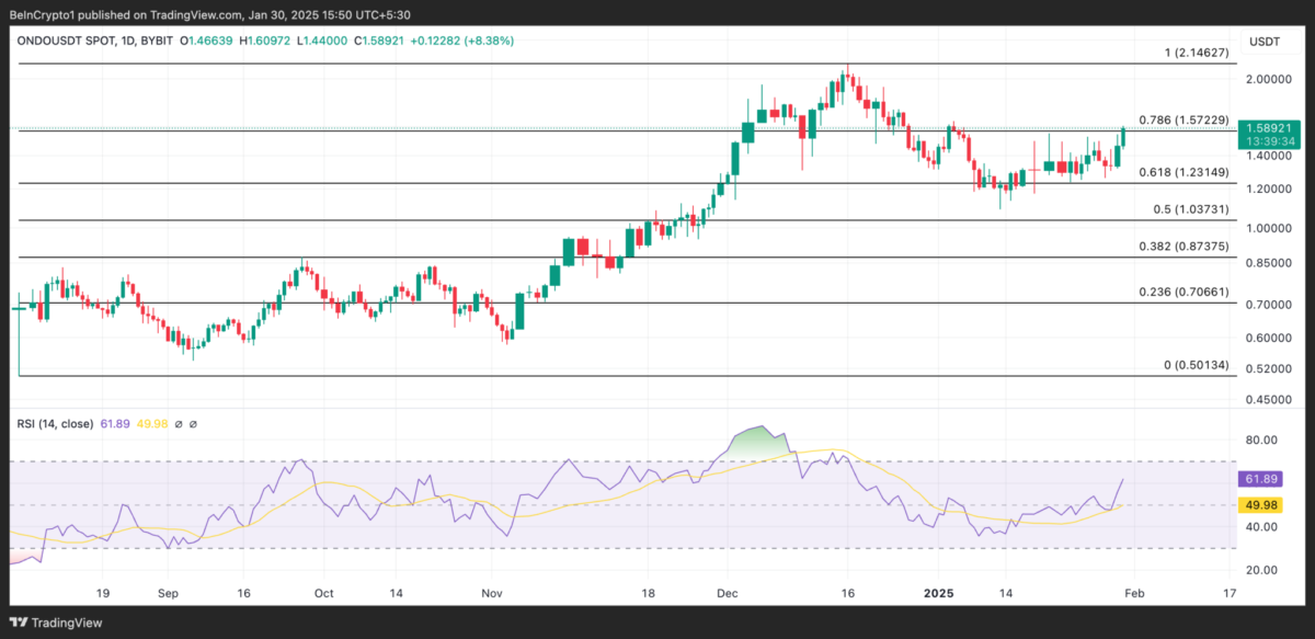 ONDO, tokenlaştırılmış bir gerçek dünya varlık platformu olan Ondo Finance’in yerel tokeni. Son 24 saat içinde değeri %13 oranında artarak yatırımcıların dikkatini çekti. Günlük grafikte, ONDO’nun yükselen Göreceli Güç Endeksi (RSI), alım baskısındaki artışı doğruluyor. Basın saatine göre 61,89 seviyesinde bulunuyor ve bu da piyasa katılımcıları arasında alım faaliyetlerinin satışlardan daha ağır bastığını gösteriyor. Bu eğilim korunursa, ONDO’nun fiyatı 2,14 dolara tırmanabilir. Tersine, trendin tersine dönmesi ONDO’nun 1,23 dolardan işlem görmesine neden olabilir.