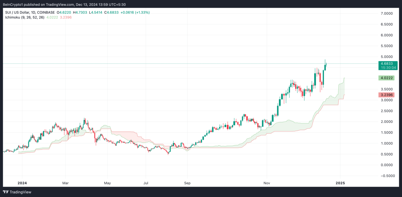 SUI coin, güçlü talep ve yatırımcıların artan güveniyle yükseliş trendini sürdürüyor. Geçtiğimiz günlerde 4.87 dolar ile ATH seviyesine ulaşan SUI, özellikle teknik indikatörlerdeki olumlu sinyallerle dikkat çekiyor. Teknik analiz tarafında SUI coin fiyatı, Ichimoku Bulutu’nun üzerinde seyrediyor.