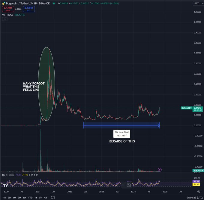 Bluntz, daha sonra popüler meme coin’i Dogecoin (DOGE) ile devam ediyor. Analist, DOGE’nin iki yılı aşkın bir birikim döneminin tadını çıkardığını söylüyor. Ayrıca, şimdi daha yükseğe çıkmaya hazır olduğunu belirtiyor. Bu bağlamda analist, “Pek çok kişi bu düşük seviyelerden giriş yapmasına rağmen DOGE’yi çok erken satmayı tercih edecek. Bu 874 günlük birikimin bir sonucudur. Beyninizi yenileyin, bir şeye inanın.” diyor. Bu arada, Dogecoin yazı sırasında günlük bazda yaklaşık %7 kayıpla 0,1588 dolardan işlem görüyordu.