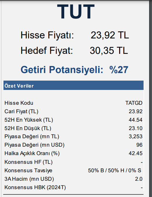 Tat Gıda için 12 aylık hedef fiyatımız olan 38,10 TL’yi 30,35 TL’ye revize ediyor, ‘AL’ tavsiyemizi ise TUT’a çekiyoruz.