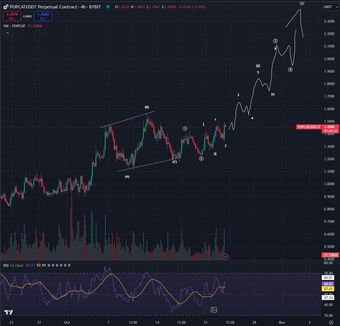 Kaynak: BluntzAnalist, teknik analizlerinde düzenli olarak Elliott Wave teorisini uyguluyor. Dört saatlik grafiğine göre Bluntz, Popcat’in beş dalgalı bir formasyonda 2,30 doların üzerine çıkacağını öne sürüyor. Elliott Wave teorisi, bir varlığın fiyatının ana eğiliminin beş dalgalı bir modelde hareket ettiğini söyler. Ayrıca, düzeltmenin ise üç dalgalı bir modelde gerçekleştiğini belirtir.