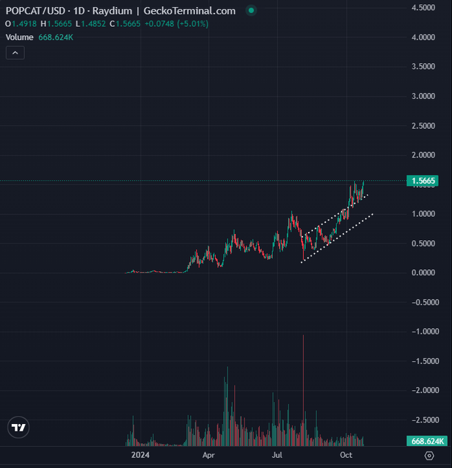 Analist ayrıca, daha önce tüm zamanların en yüksek seviyesi olan yaklaşık 1,67 dolara ulaşan Popcat’in günlük zaman diliminde yükselen bir kanaldan çıktığını söylüyor. Bu doğrultuda analist, “İlk kez bir kanalın tüm zamanların en yüksek seviyesine çıktığını görüyorum. Genellikle diplerde olurlar.” diyor.
