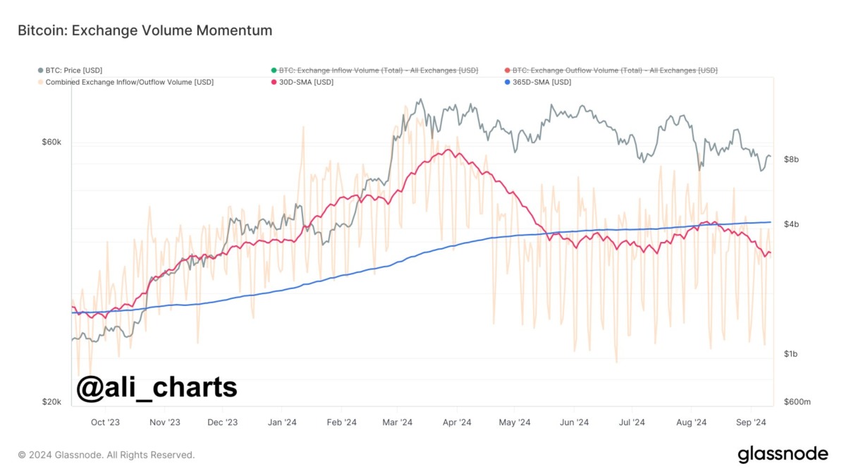 Ali Martinez ayrıca Bitcoin için borsa hacmi momentum metriğinin de düşüş sinyali verdiğini söylüyor. Borsa hacmi momentum metriği, BTC’nin borsa giriş ve çıkışlarının aylık ortalamasını yıllık ortalamasıyla karşılaştırıyor. Ayrıca, ayı yatırımcı ilgisinin azaldığını, artış ise yatırımcı ilgisinin arttığını gösteriyor. Analist, “Bitcoin Borsa Hacmi Momentumu, borsalara bağlı on-chain faaliyetlerde bir düşüş olduğunu gösteriyor. Ayrıca, BTC’ye olan yatırımcı ilgisinin azaldığına işaret ediyor.” diyor.