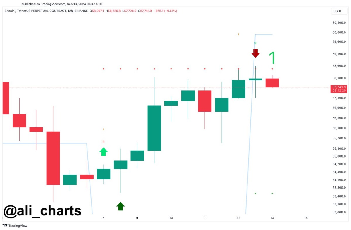 Kaynak: Ali MartinezAnalist ayrıca Tom DeMark (TD) Sıralı göstergesinin “kısa bir düzeltme” beklentisiyle 12 saatlik zaman diliminde Bitcoin için bir satış sinyali verdiğini söylüyor. Analistler, TD Sıralı göstergesini teknik analizde potansiyel yükseliş ya da düşüş noktalarını belirlemek için kullanır.