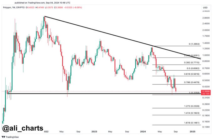 Kaynak: Ali MartinezBu arada, POL yazı sırasında 0,37 dolardan işlem görüyordu. Analist, Polygon’un 0,34 dolarlık destek seviyesi başarısız olursa, kripto para için sert bir düşüş öngörüyor. Bu bağlamda analist, “Ancak, eğer kırılırsa, 0,19 dolara kadar bir düzeltme mümkün.” diyor.