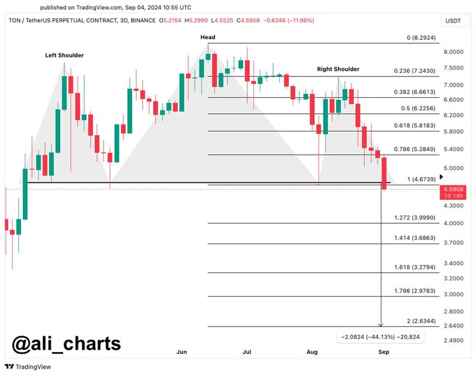 Analist daha sonra The Open Network katman-1 Blockchain’in yerel tokenı Toncoin’e (TON) bakıyor. Martinez’e göre, Toncoin’in çift haneli bir çöküşten kaçınmak için 4,70 dolar civarındaki destek seviyesini geri alması gerekiyor. Analist, “TON bunu başaramazsa, %45’lik bir düzeltmeyle 2,60 dolara kadar düşebilir.” diyor. Bu arada, TON yazı sırasında 4,67 dolardan işlem görüyordu.