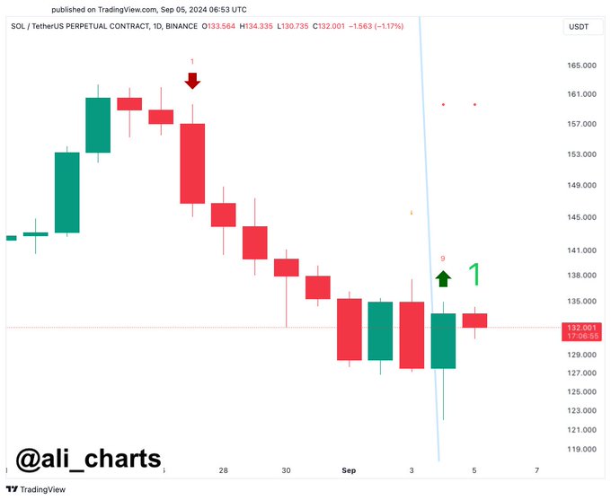 Tecrübeli analist Ali Martinez, son olarak Solana’yı (SOL) masaya yatırıyor. Analist, kripto para için “TD Sıralı göstergesi Solana günlük grafiğinde bir alım sinyali verdi. Ayrıca, bir ila dört günlük mum çubuğu arasında potansiyel bir toparlanmaya işaret ediyor.” diyor.