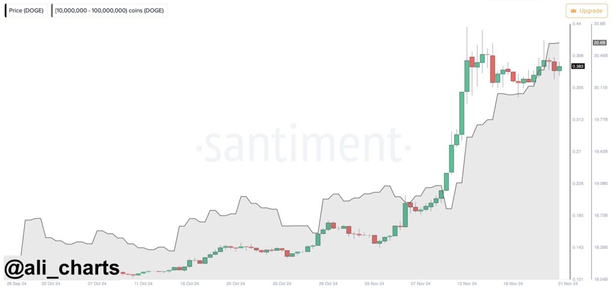 DOGE Coin fiyatı bugün %2’den fazla artarak 0,3941 dolara ulaştı. Ayrıca, bir günlük işlem hacmi 8,60 milyar dolar ile düz çizgiye yakın. Özellikle, meme coin’i 24 saatin en yüksek seviyesi olan 0,3996 doları gördü. Ayrıca, CoinGlass verileri Dogecoin Vadeli İşlem Açık Faizinin yaklaşık %9 artarak güçlü piyasa güvenine işaret ettiğini gösterdi. Dahası, son on-chain metrikler ve diğer piyasa eğilimleri de Dogecoin’in SHIB ve diğer meme coin’lerle birlikte parabolik koşusuna devam etmeye hazır olduğunu gösteriyor. Bu arada, popüler bir kripto piyasası analisti olan Ali Martinez, DOGE Coin fiyatı için bir yükseliş tahmini paylaştı. Martinez kısa süre önce, kriptonun ileride toparlanmaya hazır olduğunu gösteren artan Dogecoin balina aktivitesini vurguladı. Analist, balinaların geçen hafta yaklaşık 214,5 milyon dolar değerinde 550 milyondan fazla DOGE topladığını gösterdi.