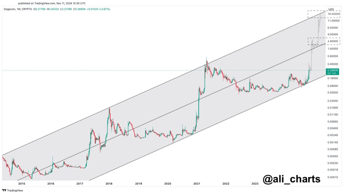 Kaynak: Ali Martinez.Buna ek olarak analist, kriptonun önümüzdeki günlerde 2,40 dolara ulaşmasının muhtemel olduğunu öngörüyor. Bu bağlamda, bu yolda ilerlemeyi gösteren bir DOGE Coin fiyat grafiği paylaştı. Ayrıca, tokenin 2.40 dolar hedefine ulaştığında, bir sonraki hedefin 18 dolar olacağını söyledi. Çünkü analist, son hamlenin, piyasa iyimserliğini tetikleyeceğini öngörüyor.