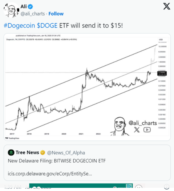 Özellikle Dogecoin ETF’sine ilişkin haberler, bu hafta DOGE fiyatında ilk artışa katkı sağladı. DOGE fiyatı Salı günü 0,4002 dolara ulaştı. Ancak meme coin, daha sonra irtifa kaybetti ve 0,3492 dolara geriledi. Dogecoin’in fiyatı ETF başvurularının ortasında dalgalanırken, Ali Martinez gibi piyasa yorumcuları yatırım fonunun nihai lansmanının DOGE fiyatını benzeri görülmemiş yüksekliklere çıkarmak için gerekli desteği sağlayacağına inanıyor.