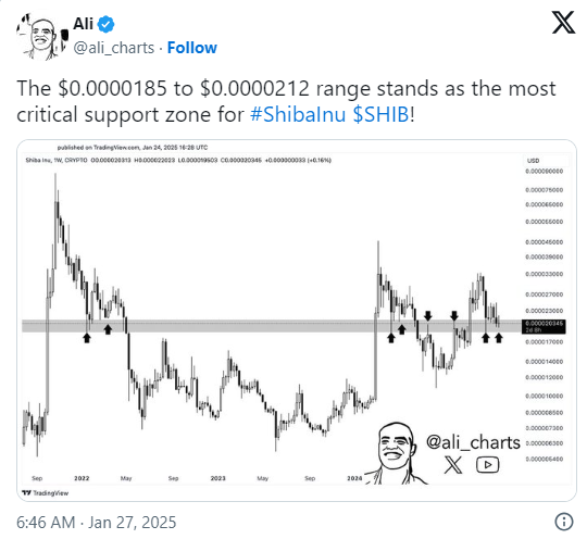 Teknik analiz açısından bakıldığında, SHIB’nin fiyatı, devam eden makro yükseliş görünümünden önce Ripple (XRP)’ye benzer şekilde makro üçgen bir konsolidasyonda sıkışıp kaldı. Bu süreçte XRP, tüm zamanların en yüksek seviyesine ulaştı. Kripto analisti Ali Martinez’e göre, SHIB’nin fiyatı şu anda 0,0000185 ila 0,000021 dolar arasında önemli bir destek aralığını yeniden test ediyor. Analistlere göre, kısa vadeli toplu kripto satış baskısı durumunda, SHIB fiyatı muhtemelen 0,000016 dolar destek seviyesine doğru düşecek. Bu da mevcut seviyelerden yaklaşık %10’luk bir düşüş anlamına geliyor. Ayrıca, haftalık Göreceli Güç Endeksi (RSI) yüzde 50 seviyesinin altına düştü. Bu da kısa vadede kontrolün ayılarda olduğunu gösteriyor.