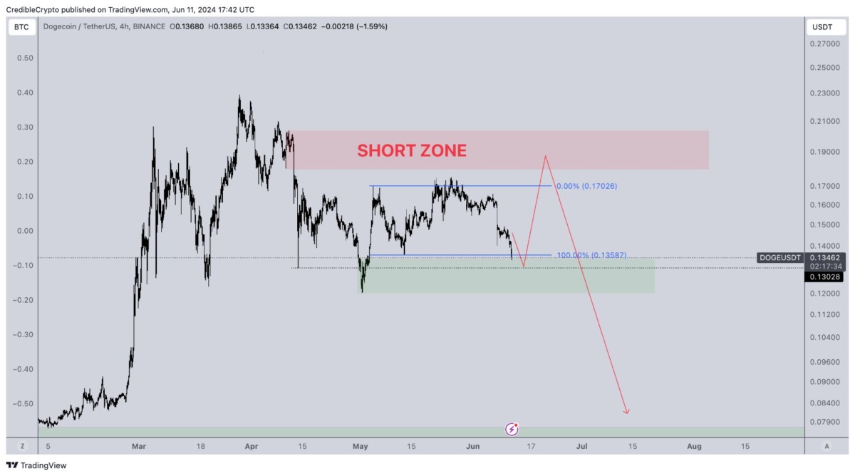 Daha sonra analist, popüler meme coin’i Dogecoin’i (DOGE) ele alıyor. Analist, DOGE fiyatının yaklaşık 0,19 dolara sıçraması için destek olarak 0,13 doları tutması gerektiğini söylüyor. Bu bağlamda Credible Crypto, şu analizlerini paylaşıyor: