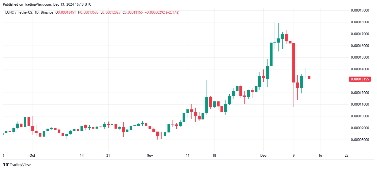 Bu sırada, LUNC fiyatı 0,0001316 dolardan işlem görüyor ve son 24 saatte %4 düşüş yaşadı. Fiyat, 0,00012 destek seviyesi ile 0,00018 direnç seviyesi arasında sıkışmış durumda. Direnç seviyesinin üzerindeki bir kırılma, XRP tarzı bir ralliyi tetikleyecek.