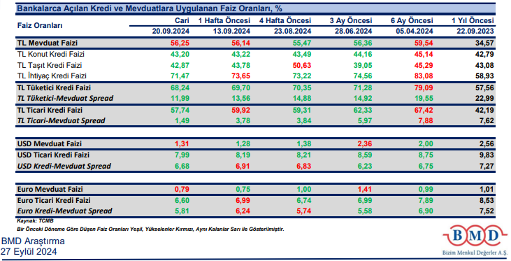Bankaların TL mevduat için uyguladıkları faiz oranı 20 Eylül haftasında bir önceki haftaya göre 11 baz puan artışla %56,25 olurken, dolar mevduat faizi 3 baz puan artışla %1,31 ve Euro mevduat faizi 4 baz puan artışla %0,79 oldu.