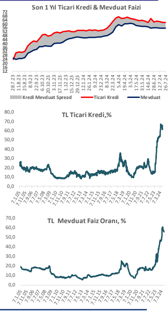TL bazlı ticari kredilerin faiz oranı ise aynı haftada bir önceki haftaya göre 1 baz puan artışla %61,81 oldu. TL bazlı konut kredi faizleri 45 baz puan azalışla %43,72; taşıt kredi faizleri 357 baz puan azalışla %50,97 ve ihtiyaç kredi faizleri 141 baz puan azalışla %74,33 olarak gerçekleşti.