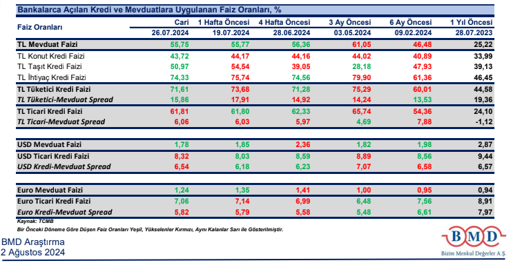 Bankaların TL mevduat için uyguladıkları faiz oranı 26 Temmuz haftasında bir önceki haftaya göre 2 baz puan azalışla %55,75 olurken, dolar mevduat faizi 7 baz puan azalışla %1,78 ve Euro mevduat faizi 11 baz puan azalışla %1,24 oldu.