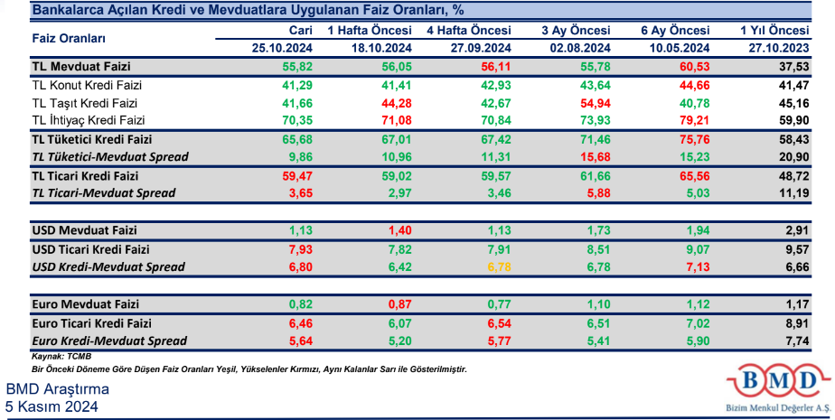 Bankaların TL mevduat için uyguladıkları faiz oranı 25 Ekim haftasında bir önceki haftaya göre 23 baz puan azalışla %55,82 olurken, dolar mevduat faizi 27 baz puan azalışla %1,13 ve Euro mevduat faizi 5 baz puan azalışla %0,82 oldu.