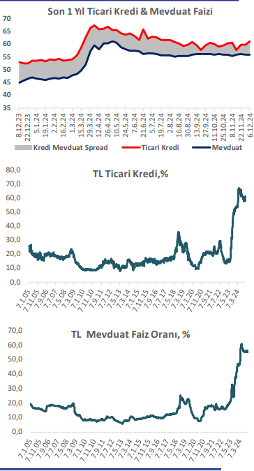 TL bazlı ticari kredilerin faiz oranı ise aynı haftada bir önceki haftaya göre 148 baz puan artışla %61,23 oldu. TL bazlı konut kredi faizleri 22 baz puan azalışla %41,11; taşıt kredi faizleri 39 baz puan artışla %38,33 ve ihtiyaç kredi faizleri 54 baz puan azalışla %69,77 olarak gerçekleşti.