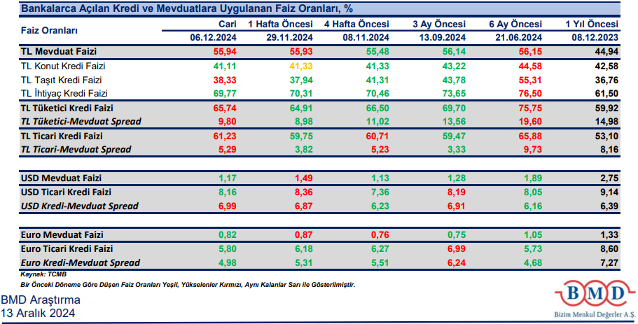 Bankaların TL mevduat için uyguladıkları faiz oranı 06 Aralık haftasında bir önceki haftaya göre 1 baz puan artışla %55,94 olurken, dolar mevduat faizi 32 baz puan azalışla %1,17 ve Euro mevduat faizi 5 baz puan azalışla %0,82 oldu.