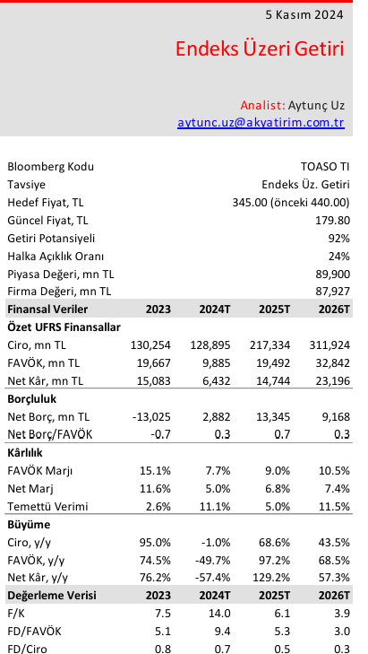 Şirket yurt içi hafif araç piyasa beklentisini 900 1100 bin adetten 1000-1150 bin adede yükseltti (AK: 1.150 bin adet). Yönetim iç piyasa satış hacmi beklentisini 120-140 bin araç seviyesinden 130-140 bin araca revize etti (AK: 134 bin adet). Yönetim ihracat satış hacmi beklentisini 40-50 bin adetten 35-45 bin adede indirdi (AK: 40 bin adet). Yönetim yatırım harcaması beklentisini 150 milyon Euro seviyesinde korudu (AK: 150 milyon Euro). Şirket VÖK marjı beklentisini %6-8 seviyesinden >%5 seviyesine indirdi (AK: %5,3).