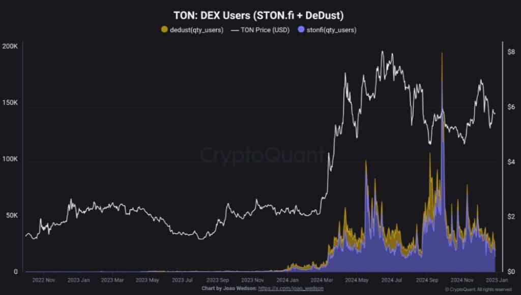 Toncoin’in swap işlemleri, özellikle STON.fi ve DeDust gibi önde gelen DEX’lerde ciddi bir azalma gösterdi. CryptoQuant analisti Joao Wedson’a göre, STON.fi üzerindeki günlük aktif kullanıcı sayısı 13.300 düştü. Bu oran, DeDust platformunda ise 5.250’ye kadar düştü. Bu sayıların, Eylül ayında her iki platformda toplamda 200.000 günlük kullanıcıya ulaşan Toncoin için büyük bir düşüş olduğu belirtilmekte. Wedson, kullanıcı sayısındaki bu azalmanın üç ana nedene bağlı olduğunu ifade etti:Ayrıntılar şu şekilde:
