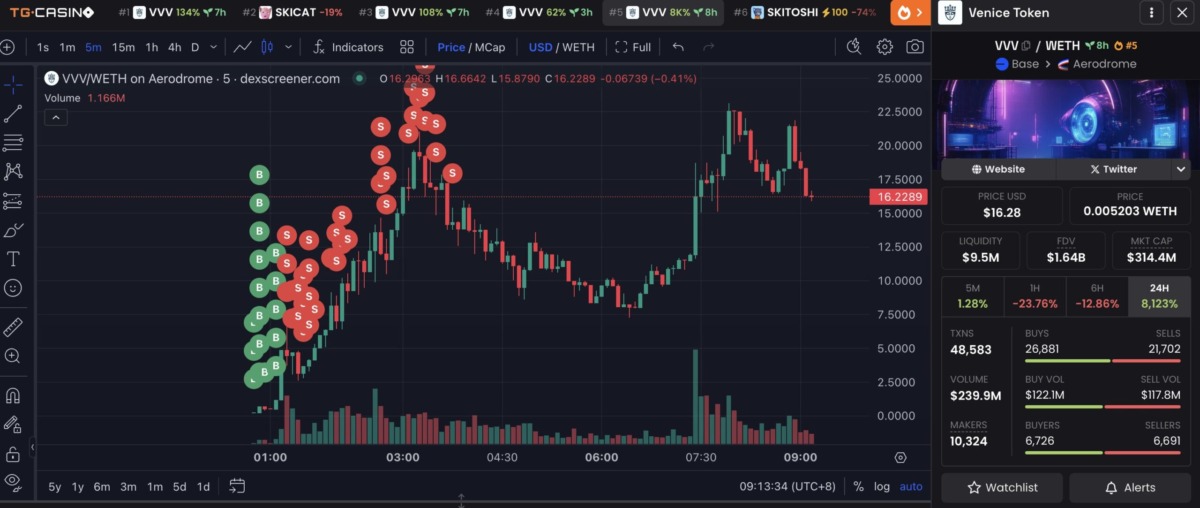On-chain analitik platformu Lookonchain’in bildirdiğine göre, trader ortalama 0,37 dolar fiyatla 414.845 VVV satın aldı. Trader, bu işlemi 28 Ocak’ta gerçekleştirdi ve bu tokenları satın almak için 48,6ETH (115 bin dolar) harcadı. Birkaç saat içinde Venice AI token fiyatı yükseldi ve holdingin değeri arttı. Bununla birlikte, trader sonuna kadar elinde tutmayı tercih etmedi. Trader, zirveyle birlikte tokenlerin önemli bir kısmını satmaya başlayarak 3,16 milyon dolar kazandı. Trader elindekileri ortalama 8 dolar fiyattan sattı. Ancak yapay zeka coin fiyatı 19,38 dolara kadar ulaştı. Bu nedenle VVV fiyatı %2000 arttığı için kârlar daha da yüksek olacaktı. Ancak, artış uzun sürmedi ve token bugün sert düşüş gördü.