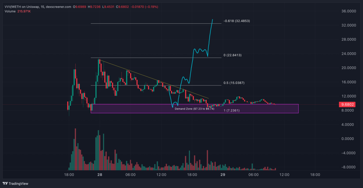 Kripto analisti Pooja Khardia, VVV’nin teknik görünümünü değerlendiriyor. VVV/WETH fiyatının azalan bir trend çizgisi var. Bu da devam eden düşüş trendini açıklıyor. Bununla birlikte, fiyat, yüksek işlem hacmini açıklayan potansiyel bir satın alma bölgesi olarak hareket eden 7,23 dolar ve 9,74 dolar talep bölgesine girdi. Sonuç olarak, bu trend, yaya zeka coin fiyatını 15 dolar ve üzerine çıkardıktan sonra 22.84 dolara doğru itebilir. Ancak, talep bölgesini aşan bir düşüş sürekli bir düşüş trendine neden olabilir.